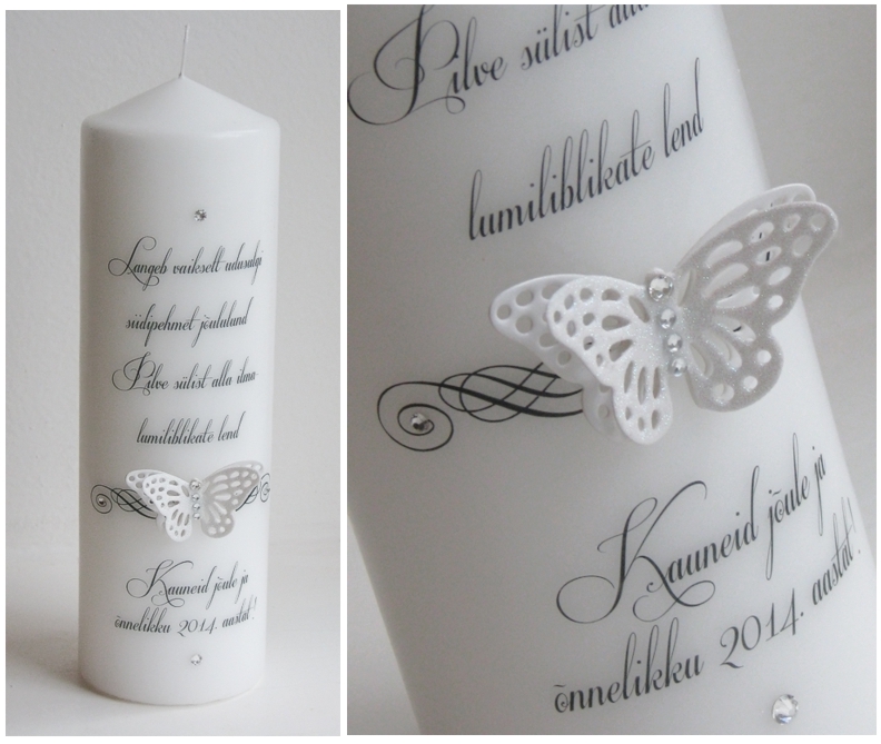 Kynttilä toteutettu Kristiinan suuniteltujen hääkutsujen mukaan |